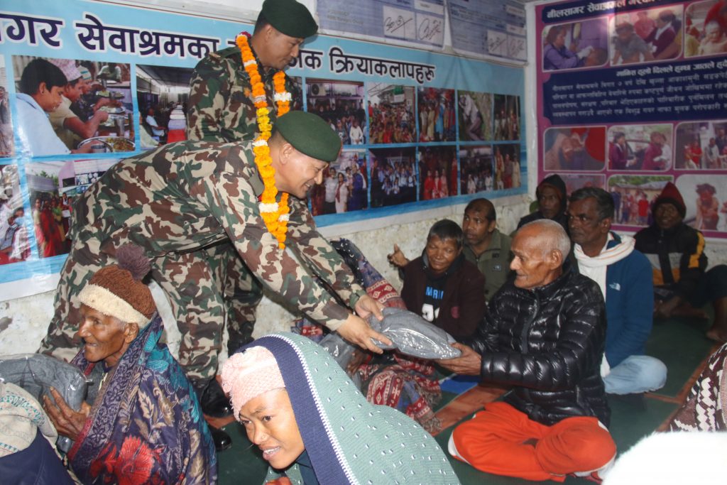 बाँके । नेपाली सेनाद्वारा बाँकेका ज्येष्ठ नागरिक तथा बालबालिकालाई न्यानो कपडा वितरण गरिएको छ । नेपालगञ्ज उपमहानगरपालिका–९ शान्तिनगरस्थित नीलसागर सेवा आश्रममा रहेका ज्येष्ठ नागरिक तथा बालबालिकालाई राँझामा रहेको श्री नं ४ वाहिनी अड्डा इमामनगर ब्यारेकका वाहिनीपति सहायक रथी प्रकाश थापा र श्री बज्रदल गणका गणपति रविन श्रेष्ठको नेतृत्वमा मङ्गलबार कपडा वितरण गरिएको हो ।