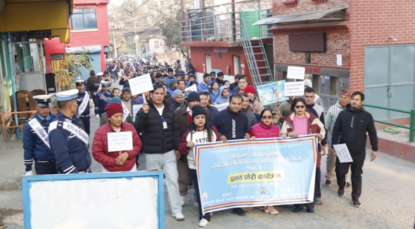 काठमाडौँ,पुस २९ । सवारी दुर्घटना न्यूनीकरण महाअभियान तथा ट्राफिक सप्ताह–२०८२ का अवसरमा ट्राफिक प्रहरी प्रभाग गौशलाले आज प्रभातफेरी गरेको छ ।